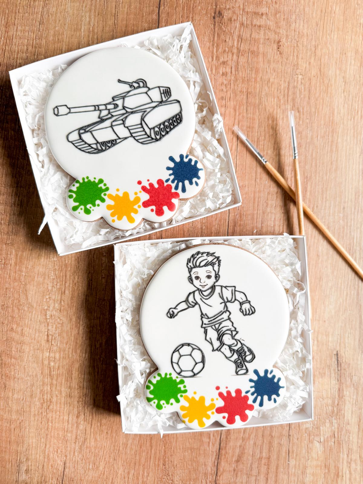Duży piernik w formie kolorowanki o wielkości 12×15 cm, dekorowany lukrem królewskim z konturowym wzorem do samodzielnego malowania. W zestawie znajduje się pędzelek oraz instrukcja zabawy – wystarczy odrobina wyobraźni i jadalne barwniki, aby stworzyć własne, niepowtarzalne dzieło.