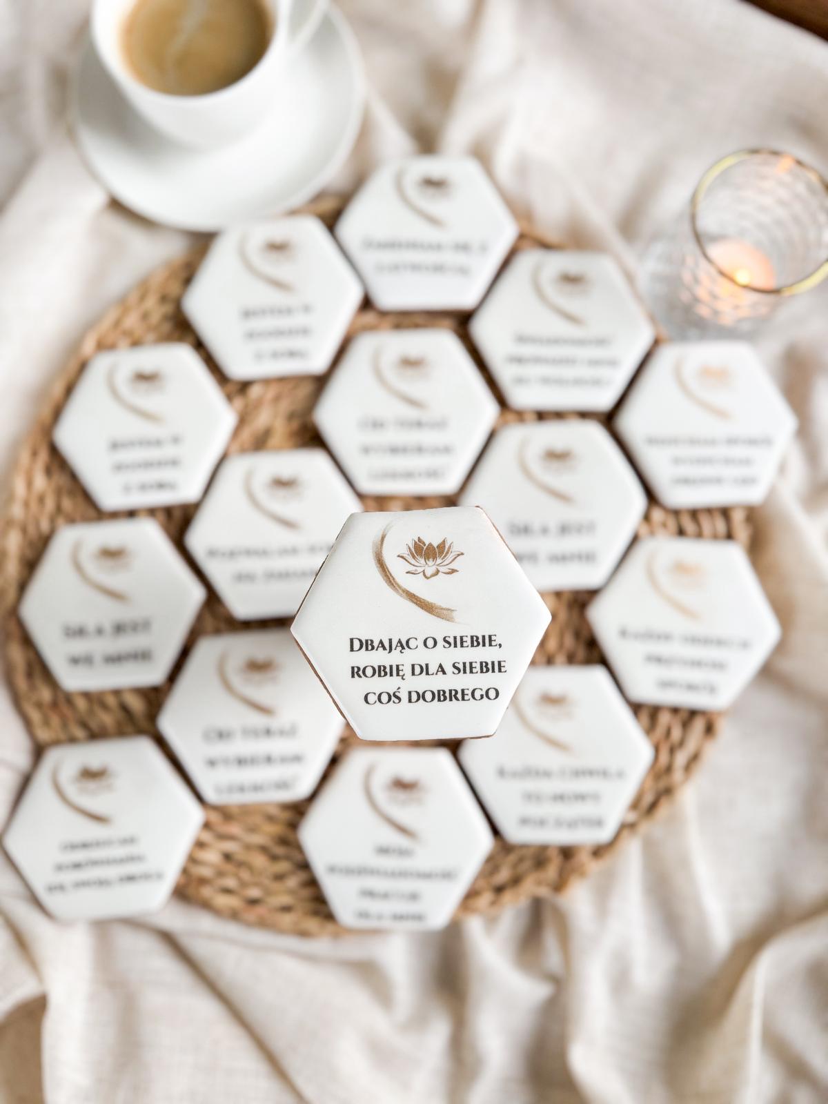 Pierniki sześciokątne 6,5×7,5 cm z afirmacjami i logo.