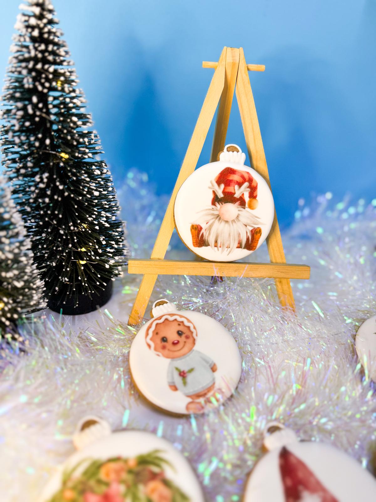 Ta piernikowa bombka to połączenie klasy i ciepła – białe tło, delikatny nadruk z motywem świątecznym. Idealny balans między minimalizmem a świąteczną magią.