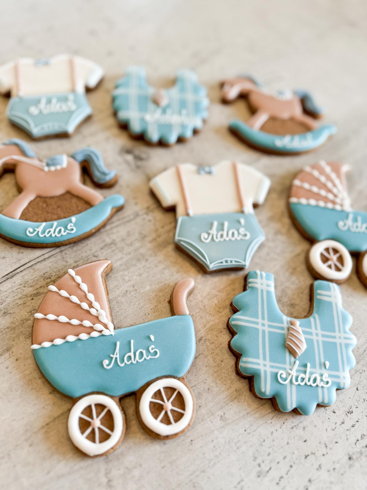 Pierniczki w kształtach dziecięcych akcesoriów – idealne na chrzest i roczek. Personalizacja i kolorystyka dopasowana do przyjęcia.