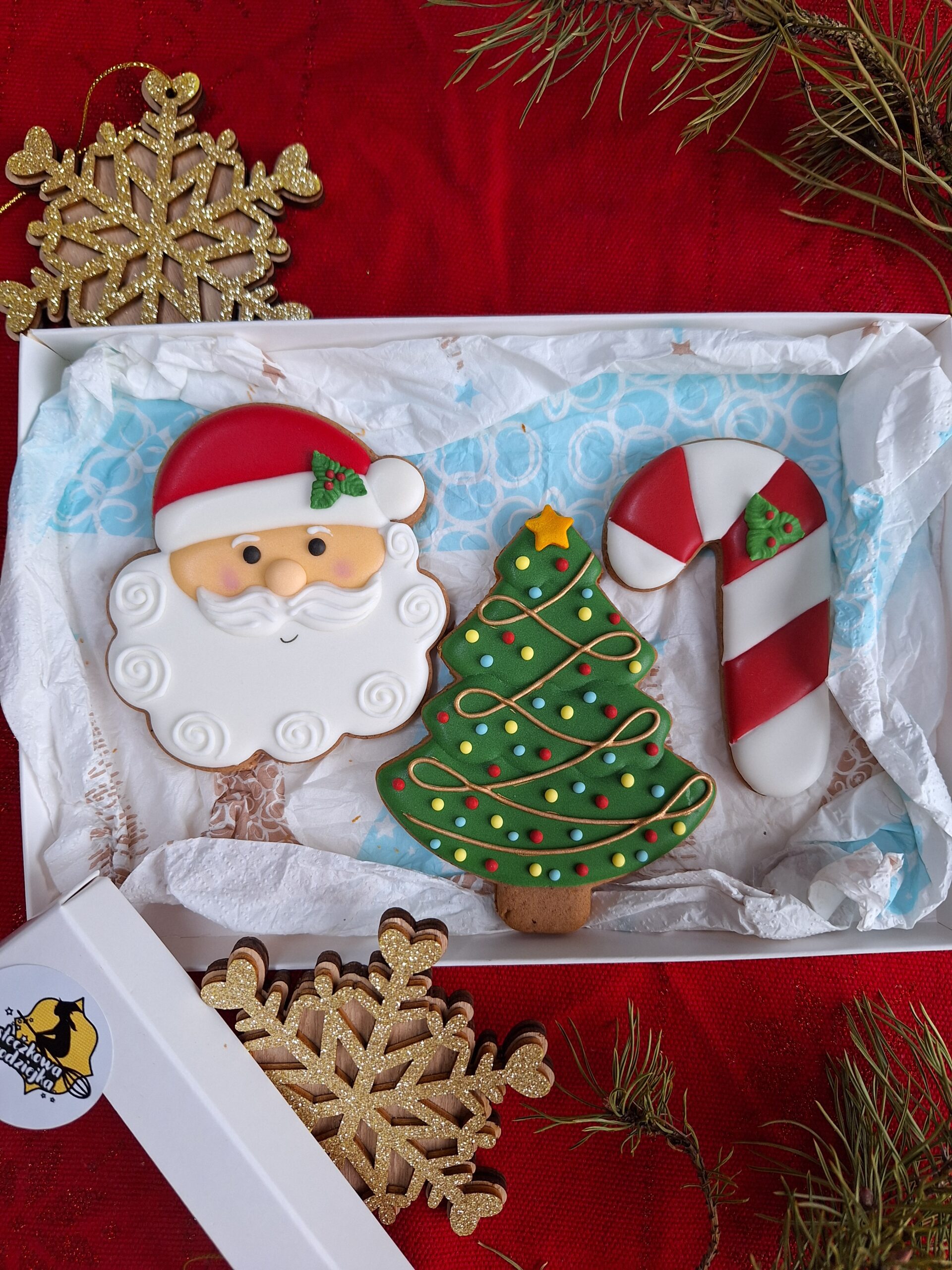 – 3 ręcznie wykonane pierniki: Mikołaj, choinka, laska cukrowa